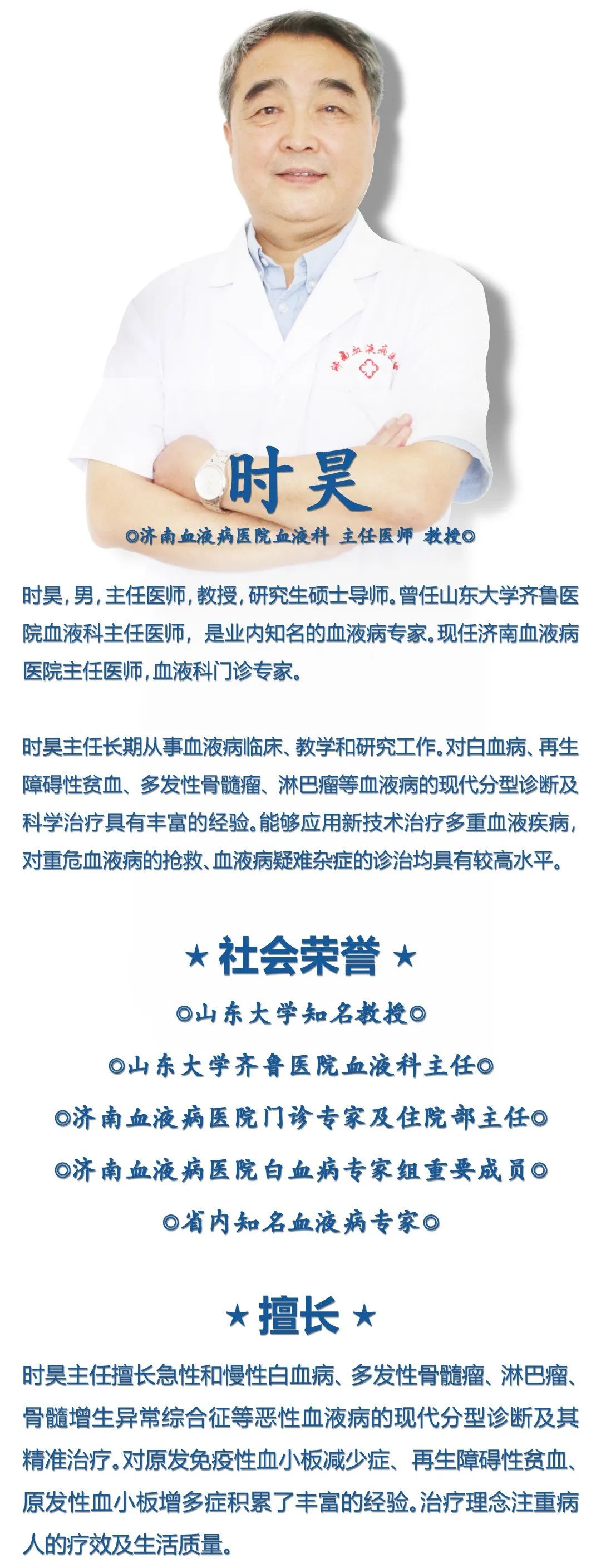 时昊(山东大学齐鲁医院)、葛林阜(享国务院特殊津贴专家)、闵捷(山东省立医院)、李文雨(血液病学术带头人)、余喆(山东省立第三医院)、朱传升(山东省千佛山医院)、崔兴(山东省中医药大学附属医院)、姜习灸(国医大师学术传承人)、张春青(山东大学齐鲁医院)